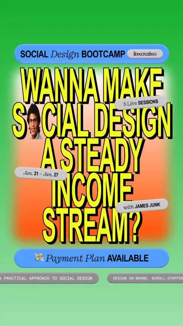 Created and taught by the designer behind @ilovecreatives’ social, James Junk. This live bootcamp is structured like a working social design studio. You’ll learn practical, on-the-job workflows, receive 1:1 asynchronous feedback on assignments, and take home resources and documents you can reuse for real social design projects.