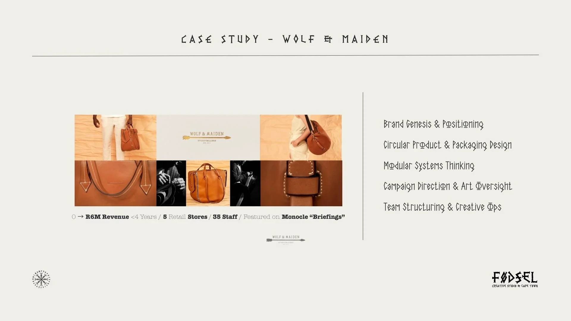 I’m drawn to design that is quiet, functional, and built to last—where form, material, and systems are equally considered. My work sits at the intersection of brand, product, and manufacturing. Projects like Wolf & Maiden and Bound represent this, while my current consultancy work focuses on extending these principles into circular, modular systems.