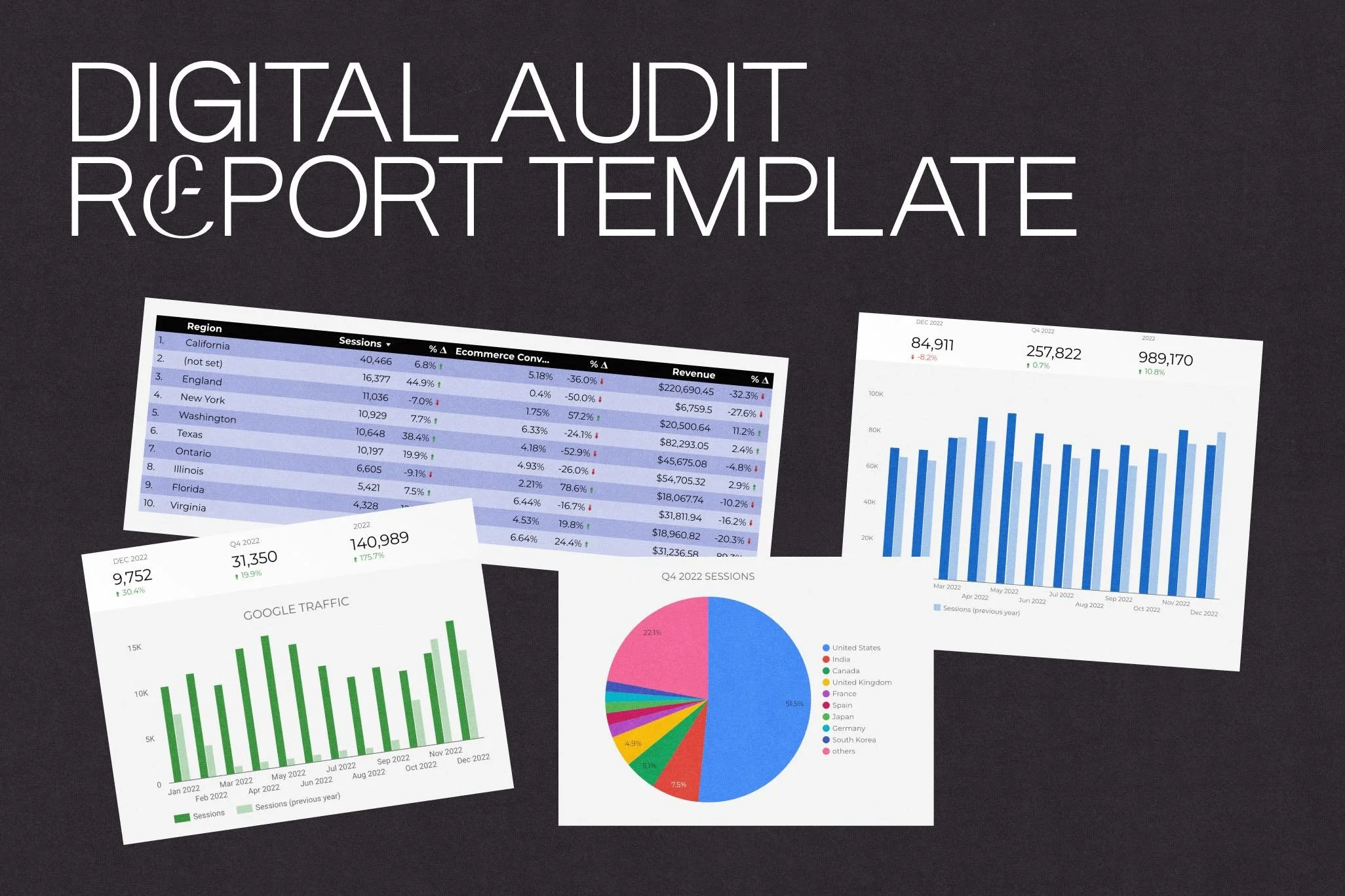 Use this template for your Digital Audit Report. Connect it to your own Google Analytics to generate graphs, reports and information that you can then share with your clients.