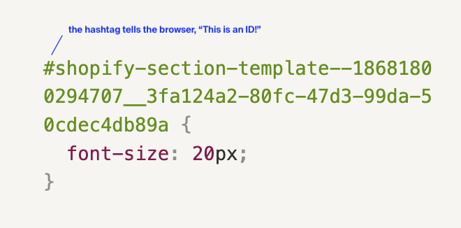 On Shopify, it’s best to reach for classes first. The random numbers on IDs can change when you update the Theme Editor, which means classes are the more sustainable (and classy) option!